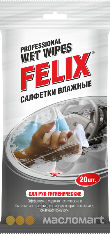 Салфетки FELIX превосходно очищают руки от сильных загрязнений. Нейтрализуют специфический запах. Уникальная рецептура на основе растительных экстрактов обеспечивает бережную очистку рук. Увлажняют кожу. Незаменимы в дороге, на пикнике, на даче, при ремонте и обслуживании автомобиля. 20 штук в упаковке.